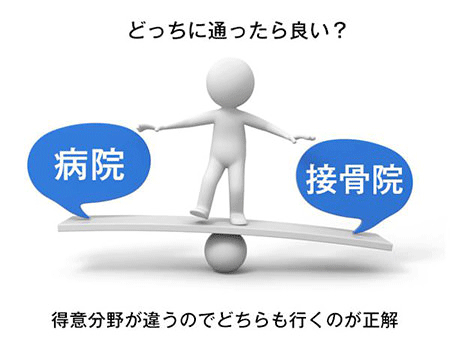 それぞれ得意分野が違いますので、あなたの痛みの状態を把握するためにも、接骨院だけではなく、病院での定期的な検査をお勧めします。