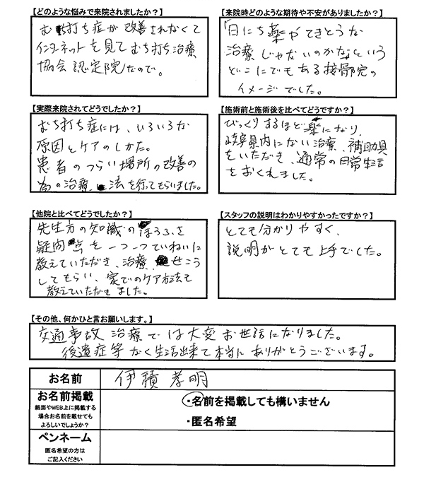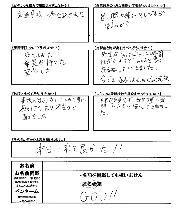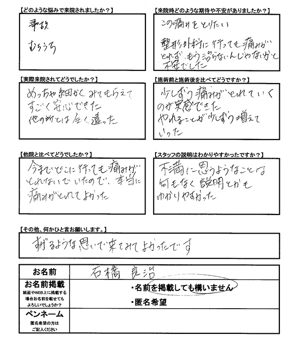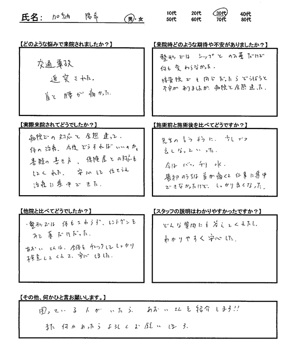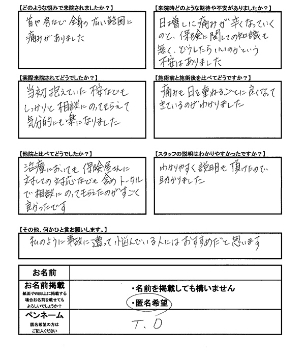 施術も保険屋さんへの対応も含め、トータルで相談にのってもらえたのがすごく良かったです。
