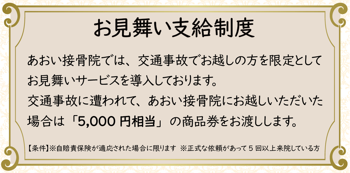 あおい接骨院では、交通事故でお越しになり自賠責保険での施術となった方を限定としてお見舞支給サービスを2018年2月11日より導入しております。